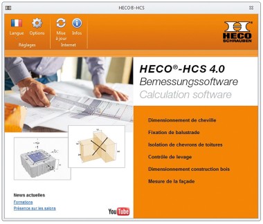 Un gain de temps notableSur la base des normes et réglementations actuelles, le logiciel de calcul fournit des calculs vérifiables et des instructions en vue d'un montage dans les règles de l'art avec des vis et des vis d'ancrage. L'avantage réside dans les économies et le gain de temps lors de la planification puisqu'il n'a plus besoin de consulter les tableaux de normes ni de se familiariser avec les Eurocodes. L'utilisateur est guidé dans le logiciel de manière intuitive. Il peut choisir entre six modules d'applications différents parmi lesquels des applications qui ne sont pas réglementées par Eurocode, par exemple, les renforcements d'appuis et de la traction transversale, les poutres entaillées et l'isolation sur toiture avec des isolants résistants ou non à la pression. Heco HCS4.0 mis à jour est disponible en sept langues et peut être téléchargé gratuitement sur www.heco- schrauben.fr à la rubrique “Services” ou commandé sur CD. Une fois le logiciel installé, les mises à jour peuvent être effectuées automatiquement