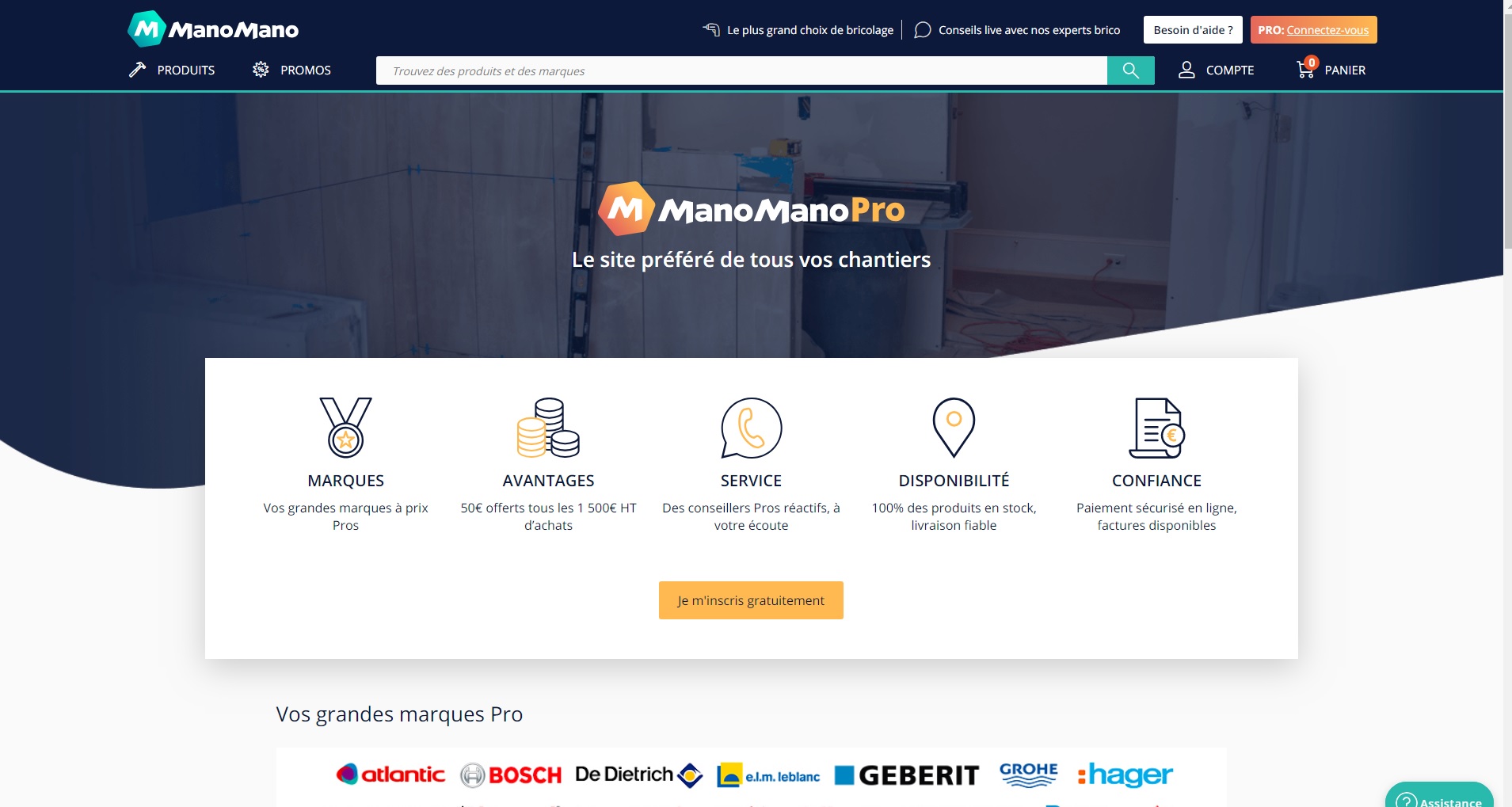 Quelle offre produits proposez-vous aux Pros ? Allez-vous jusqu’aux matériaux ?L.B : Nous avons cherché à constituer une offre qui répond aux besoins du quotidien sur tous les corps d’état. Plomberie, Chauffage, Revêtements sols et murs, électricité, menuiserie, outillage… Un certain nombre de marques, déjà référencées sur le grand public montent sur ManoManoPro avec leurs gammes professionnelles. D’autres fabricants nous rejoignent pour cette nouvelle activité qui, en plus des 3 millions de produits accessibles sur ManoMano, rassemble 20 000 produits à ce catalogue exclusif, un chiffre qui doit doubler en un an. Sur l’isolation par exemple, l’offre s’enrichit progressivement. Plus globalement sur les matériaux, nous devons résoudre des questions logistiques, mais on ne s’interdit rien. La culture de ManoMano est de ne jamais fixer de limites à nos réflexions.