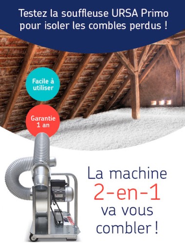 La souffleuse Primo 2-en-1 URSA aspire la laine usagée et souffle la nouvelle laine.
