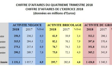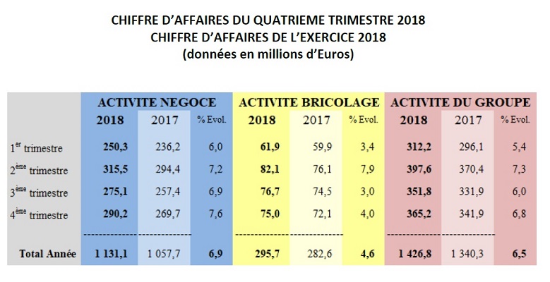 une bonne performance au troisième trimestre 2018, le groupe affiche un chiffre d’affaires consolidé qui « reste bien orienté » au quatrième trimestre avec une hausse de 6,8% par rapport à 2017 (+5,9% à périmètre comparable). Ses deux activités sont en augmentation, avec respectivement +7,6% pour le Négoce (+5,8% à périmètre comparable) et +4% pour le Bricolage (+6,1% à périmètre comparable).Sur les 12 mois 2018, le distributeur a enregistré un CA total de 1,427 Md€. Ce qui représente une croissance de 6,5% par rapport à 2017 (+5,4% à périmètre comparable). Là encore, cette bonne performance concerne ces deux branches. Avec un CA de 1,131 Md€, les enseignes de l'activité Négoce ont encore bondi de 6,9% (+5,4 % à périmètre comparable). De son côté, la branche Bricolage ressort à 296 M€ ; soit une hausse de 4,6% à périmètre réel. « En comparable, et après prise en compte des effets de périmètre sur les magasins de bricolage, l'activité affiche une bonne progression de 5,4%, nettement supérieure à l’évolution du marché du Bricolage (-0,36% à fin décembre, en glissement annuel selon la Banque de France) », précise le groupe dans un communiqué.