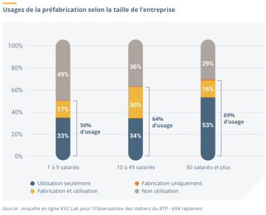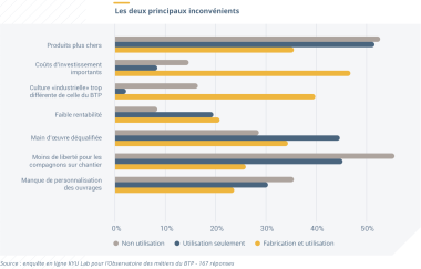 En second œuvre, l’aménagement intérieur est également adepte de la construction modulaire avec des blocs douches et sanitaires intégrés, des cheminées standardisées ou des cloisons et faux-plafonds modulables. En électricité ou plomberie/CVC, les équipements de type pieuvre sont de plus en plus répandus. Édouard Jomier reprend : « La préfabrication n’est pas réservée au neuf, elle est aussi utilisée en rénovation ». Le taux d’usage y est de 56 % (63 % en neuf). Cette fois, il est question d’éléments de parquet ou d’isolation. L’exemple le plus souvent cité étant la démarche EnergieSprong aux Pays-Bas où 80 % des produits utilisés sont préfabriqués. Mais quelles sont les limites à cette tendance ? « Les produits sont plus chers, la méthode nécessite des investissements importants », souligne l’expert. D’autant qu’il faut intégrer le coût du transport ou certains freins culturels vis-à-vis d’une crainte de standardisation du secteur. Certains imaginent que la main d’œuvre s’en trouvera moins qualifiée tandis que d’autres redoutent une pose trop délicate de produits complexes... De nouvelles compétences sont donc à développer au sein des entreprises, petites ou grandes : « La phase de conception doit forcément être beaucoup plus aboutie et finalisée au moment du démarrage du chantier. La logistique doit être structurée de façon à garantir la continuité d’approvisionnement, tandis que des contrôles qualité devront être menés sur des éléments avant leur mise en œuvre. Enfin, il faudra une coordination sans faille pour fluidifier l’intervention », résume Édouard Jomier. Des opérations qui nécessiteront aux compagnons d’acquérir des connaissances supplémentaires en conception numérique (BIM), manutention ou levage.