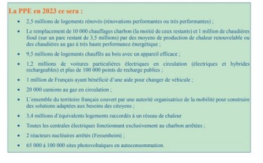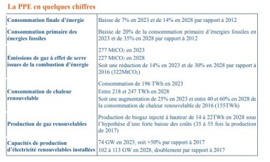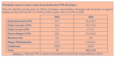 En matière de production d’électricité, la PPE prévoit « une accélération significative du rythme de développement des énergies renouvelables », selon le ministère de la Transition écologique. La part des EnR doit atteindre 27 % en 2023 et 32 % en 2028 contre 18 % en 2016. Dans sa feuille de route, le ministère rappelle que « la part du nucléaire sera progressivement réduite pour diversifier nos sources de production d’électricité ». Mais la PPE repousse à 2035 (au lieu de 2025) l’échéance de 50 % de nucléaire dans le mix énergétique français. Au total, 14 réacteurs devront fermer, dont 4 à 6 au cours des dix prochaines années. Dans le même temps, le mix énergétique entend dérouler le tapis rouge aux EnR électriques jugées « les plus compétitives » pour atteindre les 40 % d’énergies renouvelables dans la production d’électricité en 2030 comme le prévoit la loi de transition énergétique.Pour chaque filière, la PPE fixe des objectifs de développement ambitieux (voir tableau ci-dessous). Pour y arriver, le ministère a fixé un calendrier d’une dizaine d’appels d'offres par an jusqu’en 2024. « Le solaire photovoltaïque sera proportionnellement plus développé dans de grandes centrales au sol qu'il ne l'est aujourd'hui », note le ministère. Un choix justifié par la compétitivité des installations au sol comparée aux petites installations en toiture. Par ailleurs, « les grands projets (plus de 50 MW) se développeront progressivement sans subvention », prévient-il. Toutefois, le solaire sur toiture doit bénéficier de trois appels d'offres de 300 MW par an entre 2019 et 2024. De son côté, le développement de l'éolien en mer et du gaz renouvelable sera conditionné à la baisse des coûts de production de l'électricité.