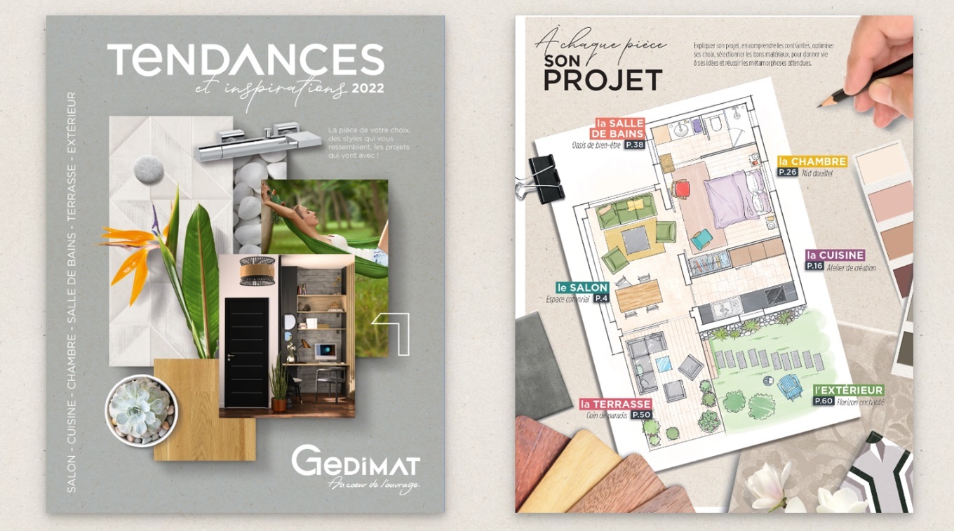 Avec des têtes de chapitre qui se veulent toutes inspirantes : Espace convivial pour le salon, Atelier de création pour la cuisine, Nid douillet pour la chambre ou encore Coin de paradis pour l’assortiment dédié aux terrasses. Comme d’autres enseignes BtoB et BtoC, Gedimat veut répondre au nouvel engouement des ménages pour leur logement porté par les confinements successifs. Avec sa ligne éditoriale, “Tendances & Inspirations” est en somme un prolongement – moins technique, mais tout autant inspirant – que le programme court de Gedimat “Ma Maison de A à Z” : un parrainage TV engagé par le distributeur depuis 2018 sur France 2 notamment.