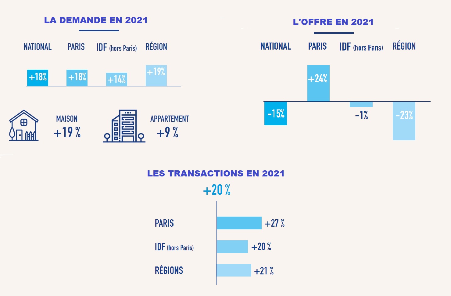 Concrètement, au niveau national, les chiffres du marché marquent une évolution de +18% dont +19% pour les maisons. Si à Paris, la demande a repris avec +18%, ce niveau reste selon l’étude « en dessous du niveau habituel ». Ce dont profite l’Île-de-France, sur laquelle se sont reportées les propriétaires en recherche de jardin ou d’appartement plus grand. Enfin, en région, ce sont les villes moyennes avec + 19 % de demandes qui emportent la palme, au détriment des grandes agglomérations.