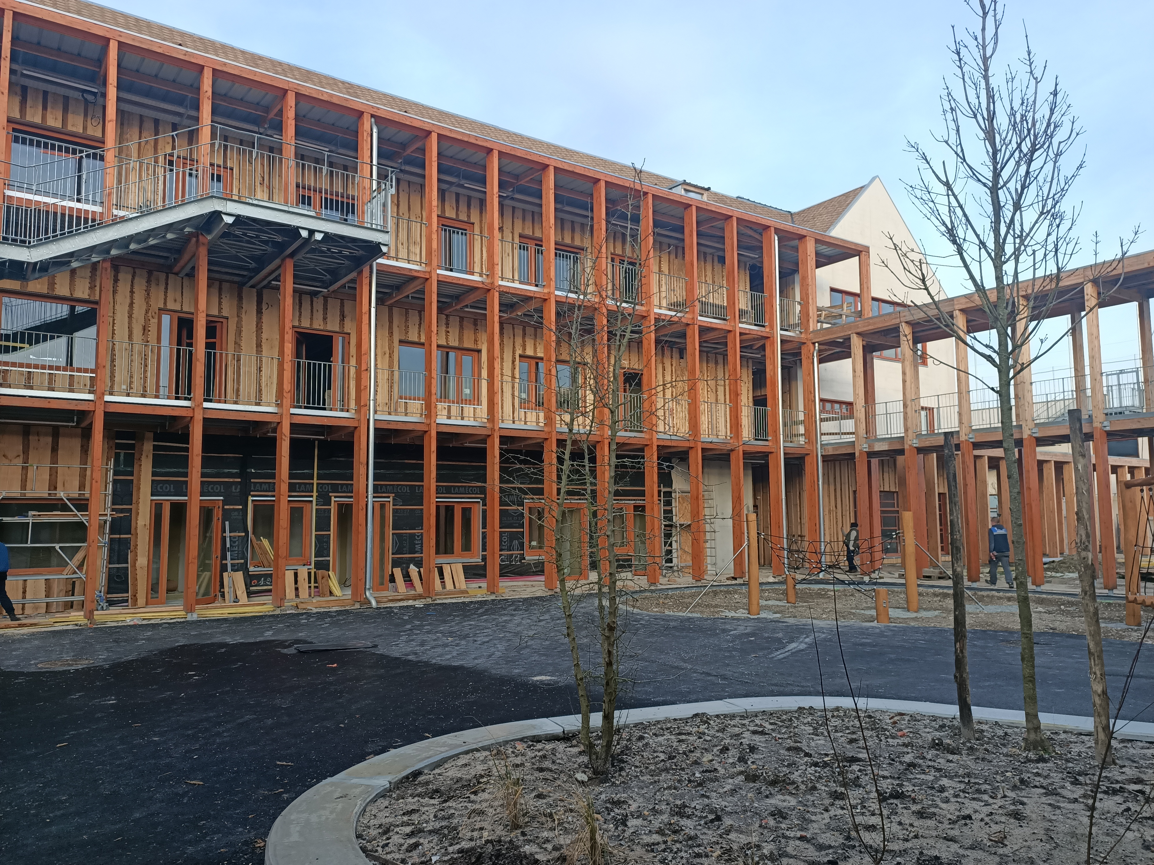 C’est là qu’intervient Knauf Insulation avec KI FIT 035. « L'isolant en laine de verre a été mise en œuvre dans ce projet afin de pouvoir avoir un bardage de bois en façade résistant au passage des enfants le long des coursives » explique Hugues Joinau, architecte au sein de Dauphin architecture. Il reprend : « La réglementation incendie impose non seulement un écran au feu, mais aussi un isolant classé selon l'Eurocode A s1 d0. Si le revêtement en façade est incombustible alors un isolant biosourcé peut-être mis en œuvre dans l'ossature bois ».