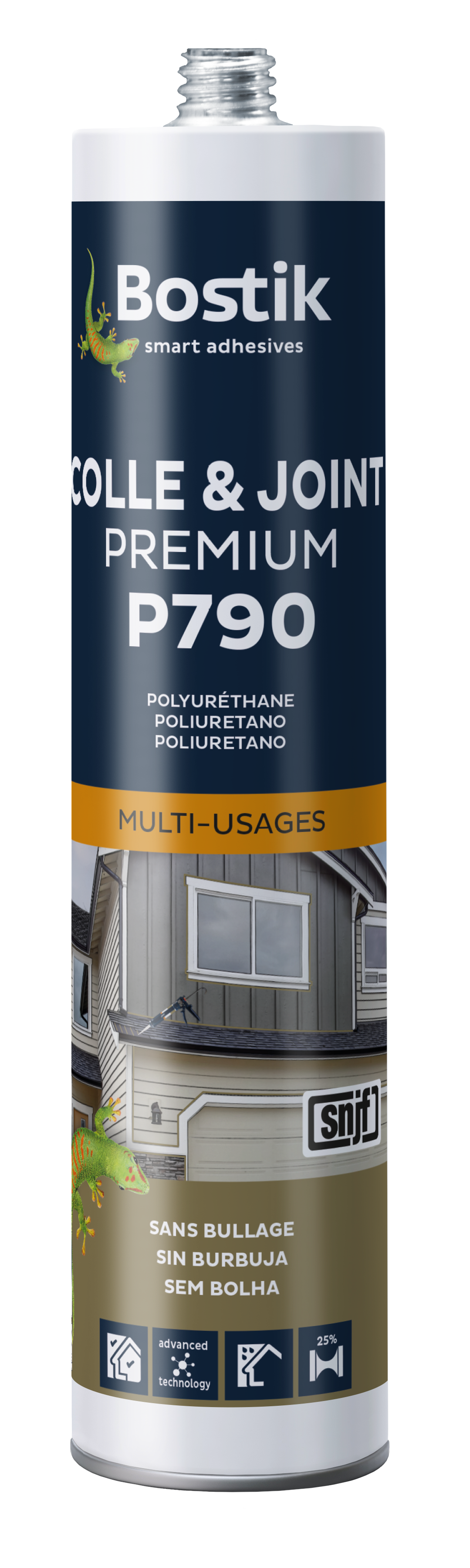 Bostik P790 Colle & Joint Premium est un mastic-colle polyuréthane multi-usage destiné à la réalisation de joints à élasticité durable d’étanchéité (bâtiment et périphérique de menuiserie), de calfeutrement, de dilatation et de sols sur la plupart des supports utilisés dans le Bâtiment (béton, maçonnerie, aluminium, bois, verre, carrelage, polyester, PVC). Il peut aussi coller le bois, les métaux, la brique, les tuiles et le PVC, et être peint après essai de compatibilité avec la peinture utilisée. Il ne contient ni phtalates, ni perturbateurs endocriniens, ni acides et émet très peu de COV en intérieur. Sa température d’application est comprise entre +5°C et +25°C et la durée de conservation est de 15 mois après production, dans un endroit sec. Cinq coloris disponibles : blanc, gris, noir, beige et brun.