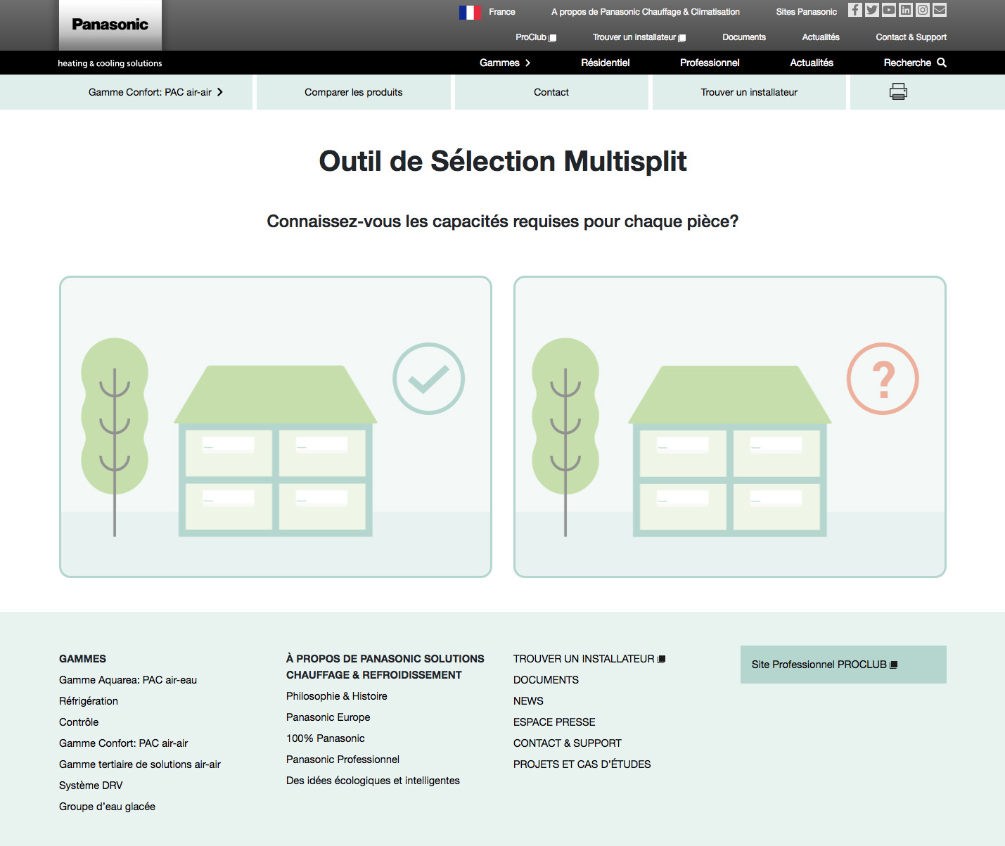 Particulièrement simple à utiliser, l’outil sélectionne le nombre de pièces à équiper, la puissance requise dans chaque pièce (si connue) ou la superficie, les types d’unités qu’on souhaite installer (murale, console, cassette ou gainable) et les combinaisons Marche/Arrêt (si, par exemple, toutes les unités ne fonctionneront pas toutes au même moment). Le logiciel recommandera alors le groupe extérieur le plus adapté ainsi que les spécifications associées. https://www.aircon.panasonic.eu/FR_fr/ranges/domestic/multi-split-selector/