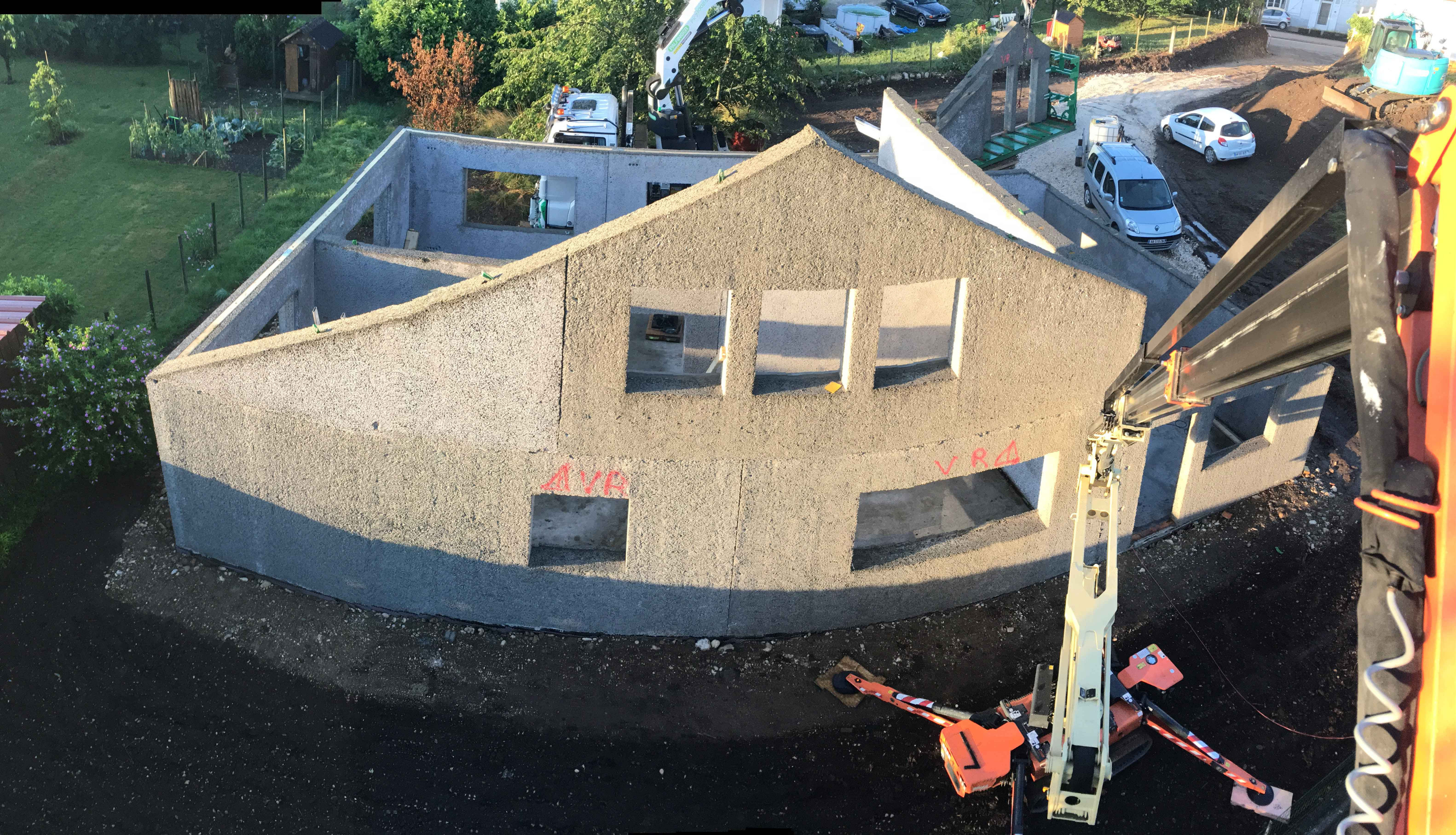 Lignoroc se lance alors dans la conception de nouveaux principes constructifs dont des panneaux porteurs à chaînage classiques. Là encore, le produit intégrera une grande quantité de matière ligneuse (90 % en volume) ce qui permet d’abaisser considérablement l’empreinte carbone de l’ensemble. « Le bilan est même fortement négatif. La fiche environnementale a été vérifiée par un organisme tiers et publiée en novembre dernier », nous confirme Laurent Noca. Pour un mur de 30 cm d’épaisseur, le poids est ainsi de -70 kgCO2/m². Avec une épaisseur moins importante, de 20 cm, il est encore de -40 kgCO2/m². D’où la possibilité d’économiser de grandes quantités d’émissions de gaz à effet de serre pour proposer des maisons et des immeubles à l’impact environnemental vraiment réduit. Et si le ciment est pour l’heure un CEM I ou II, chargé en clinker, il sera possible d’opter un jour pour un ciment moins carboné pour encore améliorer ce bilan.