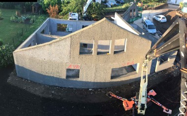 Si le bois enduit de béton est couramment employé pour la réalisation de panneaux acoustiques, cet alliage des deux matériaux n’avait – jusqu’à présent – pas de capacités structurelles. La société Lignoroc, fondée par François Cochet, issu du monde de l’exploitation forestière, entend changer les choses. « La scierie Bois du Dauphiné générait des volumes importants de chutes à valoriser », nous raconte Laurent Noca, directeur Technique & Innovation de Lignoroc. « D’où l’idée d’utiliser le coproduit du bois avec du béton pour obtenir un béton avec des granulats de bois, surtout des résineux, d’une granulométrie comprise entre 20 et 40 mm ». Depuis 2006, moment où la société a été créée, les techniciens ont travaillé à la mise au point de la formulation et des applications possibles de ce matériau, notamment pour de la préfabrication lourde de planchers et de murs pleins (homogènes). Une appréciation technique d’expérimentation est délivrée par le CSTB en 2007, suivie d’un avis technique en 2009. Une soixantaine de maisons individuelles sont ainsi construites avec ce procédé constructif à isolation répartie. « Les premiers retours étaient positifs sur la qualité », assure le spécialiste.
