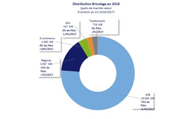 Négoce et E-commerce en croissanceAu contraire, le négoce (pour ses ventes aux particuliers) qui représente 15 % de PdM du bricolage, progresse de 1 %. En termes de croissance d’activité, le grand gagnant est sans conteste le circuit des pure players, que ce soit via les généralistes type Amazon ou spécialistes comme ManoMano. Avec 4 % du marché, ils bondissent de 18 %. Toutefois, nuance Mathieu Pivain, président de la FMB, les ventes e-commerce des GSB progresseraient plus vite en 2018 que celles des pure players. Elles sont estimées à environ 3 à 4 % de leur CA. Autres points marquants de l’étude, l’analyse par rayon montrerait un recentrage des consommateurs vers « les travaux de nécessité », par exemple liés au confort thermique. Dans les GSB, le Bâti progresse de 2,2 % en valeur en 2018 tandis que le Bois & Menuiseries bondit de 2,4 %. À l’opposé, l’univers Décoration dévisse (-3,3 %). Enseignement tiré de l’étude : les univers qui nécessitent de l’accompagnement technique ont su résister à la vague de l’e-commerce. Toutefois, pour expliquer cette évolution, on pourrait également se demander, si les achats de gros outillages et d’équipement de la personne, deux familles en forte progression, ne sont pas finalement le fait d’artisans, directement, ou de particuliers qui font réaliser leur projet. Les dispositifs financiers et crédit d’impôts ne soutiennent en effet que les travaux réalisés par les professionnels. Il n’est pas neutre de voir les GSB aujourd’hui intensifier leurs efforts pour capter les pros, que ce soit en tant que clients ou en tant que prestataires pour leur service de pose à domicile et (ou) plateformes d’intermédiation. Au cœur des enjeux de la rénovation énergétique des logements, les artisans n’ont pas fini d’être courtisés par l’ensemble des circuits de distribution… *FMB : Fédération des magasins de bricolage ; Inoha : syndicat Les industriels du nouvel habitat