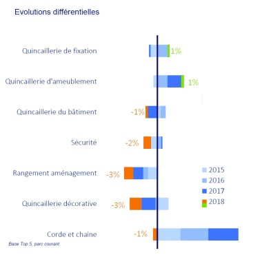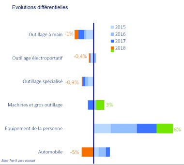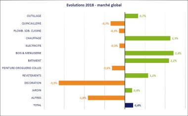 Les chiffres sont parfois trompeurs. Ainsi, la stabilité des marchés du bricolage en 2018 n’est qu’apparente, comme le souligne Jean-Éric Riche, président d’Inoha, le syndicat des industriels du secteur. Ce chiffre de +0,4 % cache de fortes disparités : entre rayons tout d’abord mais aussi entre circuits de distribution. (voir graphes ci-dessous)