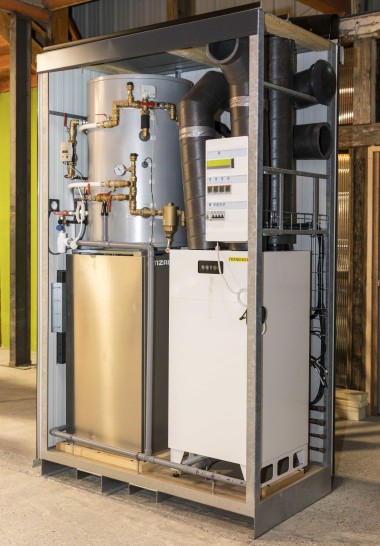 Concernant le module gaz, toujours pour le collectif, c’est la Box d’Eolya et France Air qui décroche le titre. Dans le cadre du projet Es’Ope l’entreprise Eolya a développé un local technique préfabriqué regroupant tous les équipements nécessaires à la production d’énergie et au renouvellement d’air. L’installation peut ainsi se gruter directement sur une toiture et se raccorder aux différents réseaux. EnergieSprong France précise : « L’innovation réside dans l’intégration à l’Eolya Box d’une solution de PAC à absorption gaz couplée à la récupération de chaleur sur l’air vicié et sur des panneaux solaires thermiques ». Les calories ainsi récupérées sont dirigées vers un ballon de stockage qui sert de source « froide » à la pompe à chaleur afin d’améliorer son rendement toute l’année. Le COP oscille ainsi entre 4,5 et 6. Le système peut être encore renforcé grâce à la récupération de chaleur produite par le brûleur à gaz de la PAC, ainsi que par la réaction thermochimique entre l’ammoniac et l’eau.