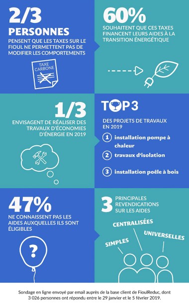 Dans le cadre du Grand Débat National, FioulReduc a interrogé 3 026 de ses clients chauffés au fioul. Voici les 3 principales conclusions de cette consultation. D’abord, une majorité n'est pas prête à quitter le fioul. En 2019, malgré l'augmentation des aides, seuls 12 % envisagent de changer d'énergie tandis que 22 % pensent réaliser des travaux d'isolation. Ensuite, après 376 € d'augmentation moyenne de la facture de fioul entre 2017 et 2018, la pause dans la hausse de la taxe carbone est accueillie avec soulagement. 60 % des répondants appellent à plus de transparence sur l'utilisation de cette taxe et souhaiteraient qu'elle finance en priorité les aides pour la transition écologique. Enfin, les aides et les solutions proposées par le gouvernement laissent les répondants sceptiques, et ce pour plusieurs raisons : 47 % ne savent pas s'ils y sont éligibles, 57 % ne sont pas raccordables au gaz de ville, une majorité doute de l'efficacité des pompes à chaleur, tandis que beaucoup craignent la recrudescence des arnaques de la part de chauffagistes peu scrupuleux. Pour Hervé Degrève, co-fondateur de Fioulreduc, « au vu des réactions des particuliers concernés, l'objectif annoncé par le gouvernement de tripler le rythme de remplacement des chaudières au fioul (600 000 remplacements en 2 ans) semble très ambitieux. Même s'il existait des solutions de substitution adaptées à toutes les situations et si les aides étaient élargies à l'ensemble de la population, les Français ne changent pas de chaudière comme ils changent de voiture, la plupart attendront que leur équipement tombe en panne pour le changer ».