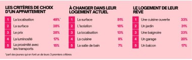 Quand on leur demande ce qu'ils souhaiteraient changer dans leur logement actuel, plus de la moitié des jeunes choisit d'en agrandir la surface ; le manque d'espace est une préoccupation des jeunes. Cependant, à budget équivalent, 70% des 15-25 ans opteraient pour un logement moins grand avec un extérieur, contre un logement plus grand sans extérieur. À l’intérieur, ils sont nombreux à évoquer le besoin d'une meilleure isolation phonique ou thermique, ainsi que des équipements de meilleure qualité, notamment dans leur cuisine. Dans le détail, avoir un espace ouvert est le critère principal avec notamment la cuisine ouverte pour un tiers des 15-25 (33%) fait partie des figures imposées de l’appartement idéal spacieux. Lorsque le budget n’est plus une contrainte, le critère n°2 de logement idéal aux yeux d’un jeune est la présence d’un extérieur. Jardin, balcon, terrasse... 31% listent comme critère un espace ouvert dans leur description de l'habitat idéal. Dans leur imaginaire, les interrogés visualisent aussi la présence d’une baignoire (23%), ou encore d’un garage (20%). Urbanité ou ruralité ? La génération Z situe son logement idéal en ville ou en périphérie (69%) plutôt qu’en milieu rural (31%).