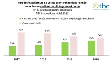 En 2020, le segment des volets roulants a consolidé sa position de leader avec 74 % de parts de marché en volume : soit plus de 4,4 millions de volets roulants posés en 2020. Selon TBC Innovations, les utilisateurs apprécient leur facilité de manœuvre, leur fonctionnalité, la sécurité de fermetures et le confort qu’ils apportent quelque que soit la pièce. Les volets battants et volets coulissants, eux, captent près de 22 % du marché français. « Traditionnellement présents sur des bâtiments tertiaires, les BSO (brise-soleil orientables) augmentent leur pénétration dans les logements ces dernières années. Ces solutions largement développées en Suisse, Allemagne, Autriche, restent en France un marché de niche », selon l’étude. Par ailleurs, la motorisation est souvent à l’origine d’un projet de changement de volets. Segment toujours en croissance, les volets motorisés représentent près de 58 % du marché français en 2020. Enfin, la pose de systèmes de pilotage intelligents (smart home) continue de progresser sur le marché résidentiel des volets. En 2020, 46 % des installateurs de volets ont déclaré en avoir installé « La pénétration de ces systèmes de pilotage progresse ! Ils étaient 41 % en 2019, 32 % en 2018 et 29 % en 2017 à installer ce type de système. Si 46 % des installateurs interrogés lors de l’enquête de TBC déclarent avoir installé durant l’année 2020 des systèmes smart home de pilotage, 54 % d’entre eux n’en installent pas. 12 % comptent tout de même en installer à l’avenir ». Il reste donc aux marques et aux distributeurs à convaincre 42 % de professionnels n’imaginant pas en installer à l’avenir.