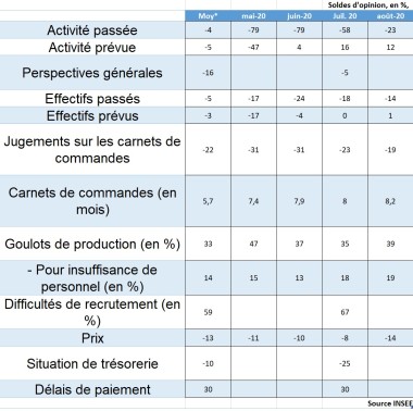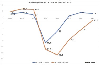 Optimistes mais mesurés, les entrepreneurs du Bâtiment ont plutôt bien profité de l'été. Toutefois, toujours à un très haut niveau, leur opinion sur les trois prochains mois accuse un petit repli, note l’Insee, par rapport à leur état d’esprit enregistré au mois de juillet. Le retour ici et là en France de clusters dont les annonces ont émaillé le mois d’août ont un peu entamé leur confiance. Mais pas entièrement puisqu’ils se montrent quand même globalement positifs sur l’évolution à venir des effectifs.
