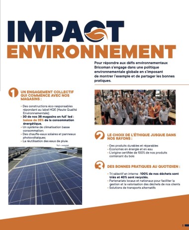 Dans ce catalogue, Bricoman fait aussi la part belle à la fabrication française car « pourquoi aller chercher à l’autre bout du monde ce qu’on sait produire chez nous ? », à sa politique environnementale (voir l’infographie ci-dessous) et ses valeurs humaines.