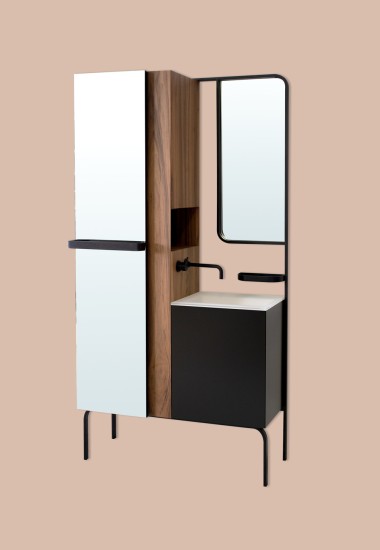 La médaille d'argent est attribuée au meuble Tiny de Sanijura. Gain de place avec une emprise au sol de seulement 2 m² incluant l’emplacement d’une douche, cette solution tout-en-un combine point d’eau, miroir, rangements, accessoires et chauffage (film chauffant rayonnant appliqué sur l’intérieur de la porte).