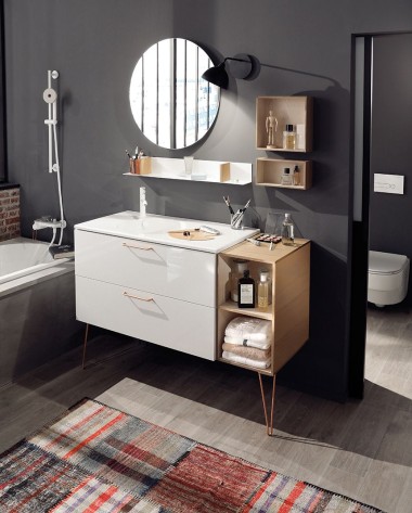 La collection Odeon Rive Gauche de Jacob Delafon (meuble avec vasque à poser ou plan-vasque, robinetterie, WC et baignoire coordonnés)