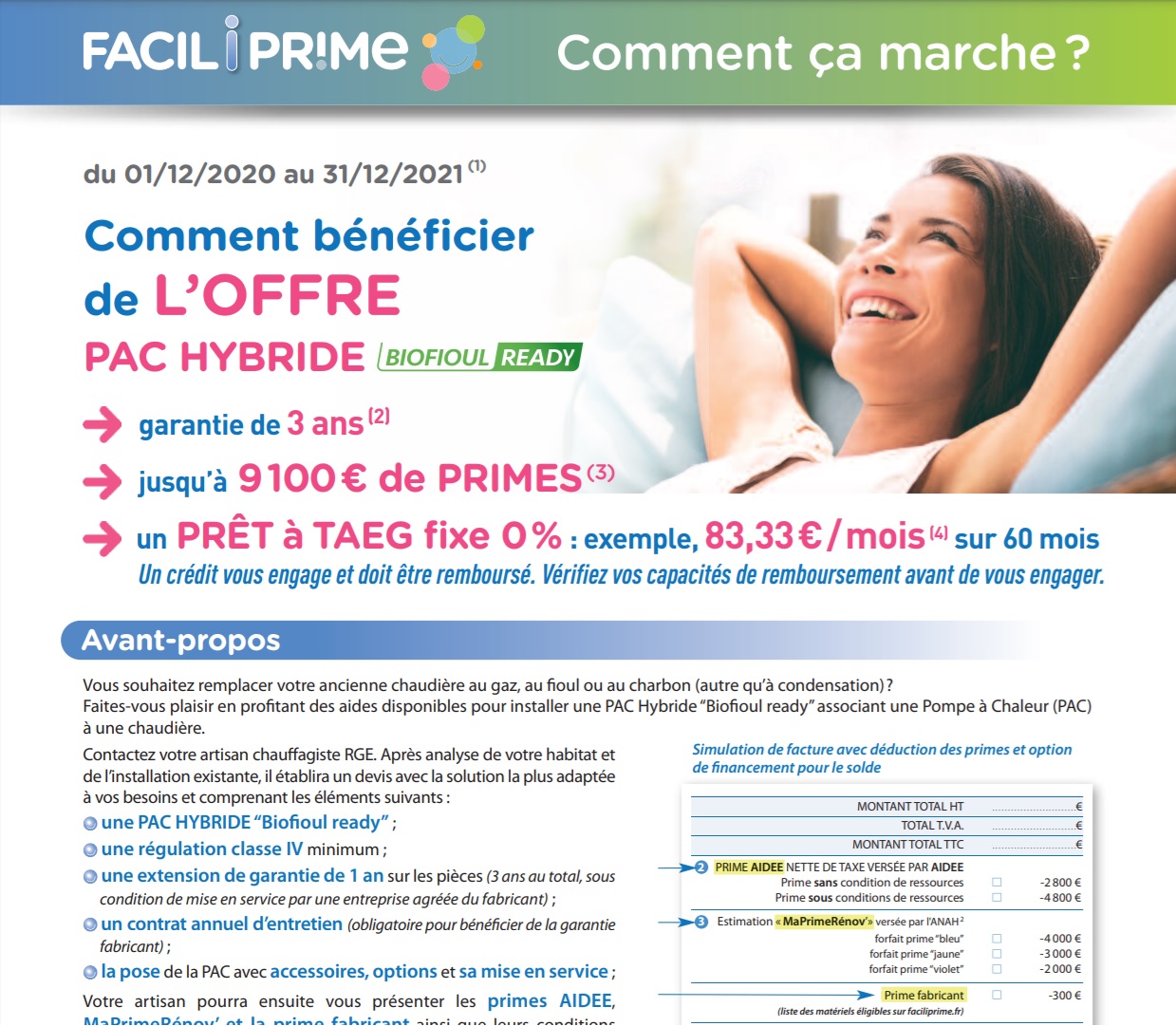 L’Association interprofessionnelle pour le développement de l’efficacité énergétique (Aidee), spécialistes des CEE, énumère tous les avantages de l’offre Faciliprime : tout d’abord une aide substantielle pouvant aller jusqu’à 4 800 € de prime « CEE Coup de pouce Chauffage », puis une autre aide potentielle jusqu’à 4 000 € « Maprimerénov’ » de l’Anah, et enfin, une geste commercial de la part de sept fabricants d’équipements ( Atlantic, Auer, Chappée, De Dietrich, Domusa, Oertli, Perge) qui font une remise de 300 € à déduire sur le devis du client. Ce sont donc jusqu’à 9 100 € de primes cumulées qui peuvent être obtenues par les consommateurs, en fonction de leur éligibilité aux aides. Les équipements pourront également être mensualisés dans une offre packagée tout inclus, avec garantie étendue à 3 ans, à partir de 83,33 €/mois sur 60 mois (crédit Franfinance, Société Générale).
