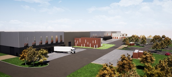 EN PHOTO • À l’image des bases logistiques de Téréva, Mabéo Industries, l’enseigne sœur du groupe Martin Belaysoud, souligne que sa nouvelle plateforme unique symbolise « la preuve des engagements RSE » du distributeur. Ici, vue 3D du futur hub de Mabéo Industries à Montagnat (Ain).