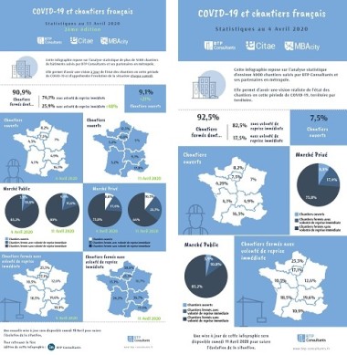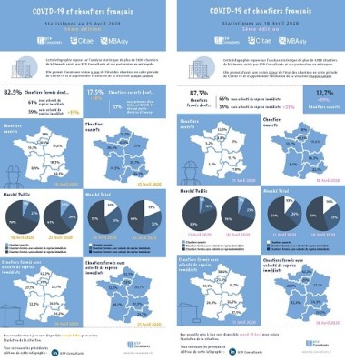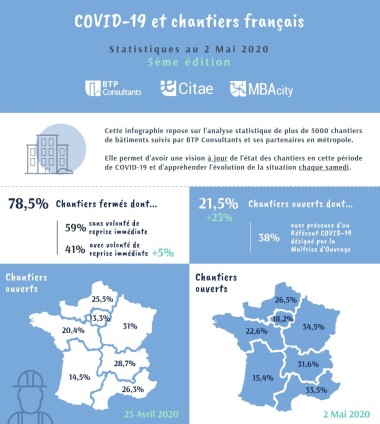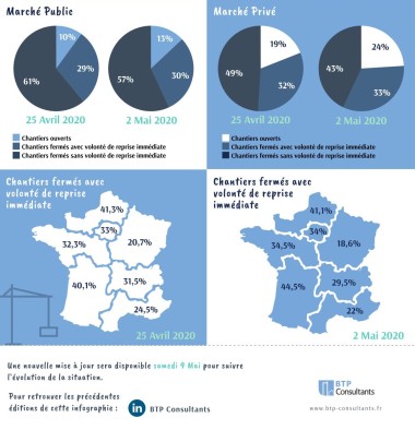 • Au cours du 27 au 30 avril (la 7e “semaine Covid-19”), il y avait 21,5 % de chantiers ouverts – marchés privé et public confondus.