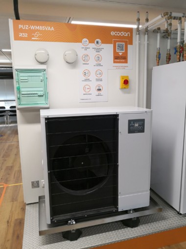 Légende photo : Le grand showroom est organisé en deux parties distinctes : à gauche de l’allée principale, l’activité tertiaire et à droite, le résidentiel. Chaque système est opérationnel comme ici une PAC air/eau Ecodan au R32 d’une puissance de 8 kW.