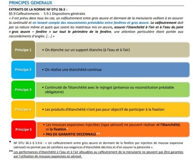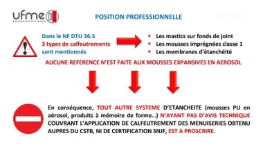 Pour le syndicat national des fabricants de menuiseries (UFME), c’est plus qu’une mise en garde. C’est une opposition frontale sur l’utilisation de mousses d’isolation flexibles pour réaliser le calfeutrement des menuiseries sur gros œuvre et leur étanchéité. Face à la recrudescence de questions des professionnels, l’organisation syndicale a édité courant avril une fiche synthétique de « position professionnelle » où l'organisation professionnelle formule ses recommandations. Tout d’abord, ces mousses expansives (polyuréthane en bombe, produits à mémoire de forme) n’ont reçu aucune validation du CSTB ou du Syndicat national des joints et façades (SNJF). Risques encourus : ces solutions ne donnant pas satisfaction en termes d’étanchéité à l’air et l’eau et, ne servant pas à la fixation, leur utilisation n’est pas couverte par la garantie décennale. Valable pour tous types de matériaux de menuiserie, en neuf ou rénovation avec conservation du dormant, le document ne se substitue pas aux règles de l’art et normes en vigueur (NF DTU 36.5 et cahier du CSTB n° 3521) qui, seules, garantissent une pose conforme. D’ailleurs, seules trois solutions de calfeutrement sont validées par le CSTB : mastics sur fond de joint, mousses imprégnées de classe 1 et membranes d’étanchéité.