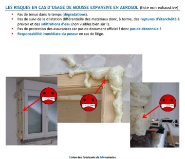 [Zepros Bati] De plus en plus confrontée à une recrudescence de questions de la part des poseurs professionnels de la baie, l’Union française des fabricants de menuiseries (UFME) leur déconseille formellement d’avoir recours aux mousses expansives en aérosol pour assurer l’étanchéité entre tout type de menuiseries et le gros œuvre.
