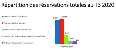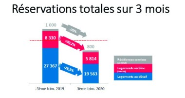 Quant à la demande, là aussi les chiffres sont négatifs avec moins de 20 000 logements réservés par des particuliers au T3, soit une baisse de 28,5 % par rapport au T3 2019. Sur neuf mois, la baisse atteint 29,5 % (‐34 000 logements). Accession à la propriété et investissement locatif sont impactés sous l’effet conjugué du manque d’offre et du resserrement du crédit bancaire. Sur les ventes en bloc, à la fois logements sociaux et intermédiaires, le recul s’établit à 30 %.