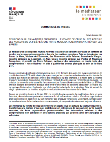 Dans un contexte toujours tendu de pénurie et hausses des matières premières, un nouveau comité de crise s’est réuni autour du Médiateur des entreprises avec les principaux acteurs du BTP.