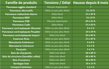 A la question, "peut-on parlé de pénurie?", le message de la Fédération Nationale du Bois s'attache aux bémols : « il n'y a pas de pénurie sur tous les produits et elle concerne, lorsqu'elle existe, aussi bien les Bois et Dérivés que les produits de Second-œuvre et les matériaux lourds ». Il faut ainsi examiner le problème au cas par cas. D’un côté, selon Jacques Barillet, peu ou pas de pénurie sur les panneaux décoratifs, le contreplaqué Okoumé ou Peuplier, sur les essences fines, sur la menuiserie et sur le parquet. De l’autre des délais de livraison plus longs sur le bois d'ossature, les bardages et les lamellés collés, les agglos bruts, les mélaminés blancs et les OSB. Enfin, sur le cas de la charpente, les délais là aussi sont un peu plus longs, mais « les scieurs français et quelques scieurs allemands se sont substitués assez efficacement aux scieurs scandinaves qui exportent peu vers la France désormais ».