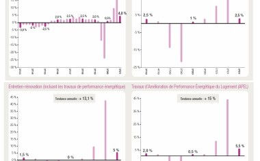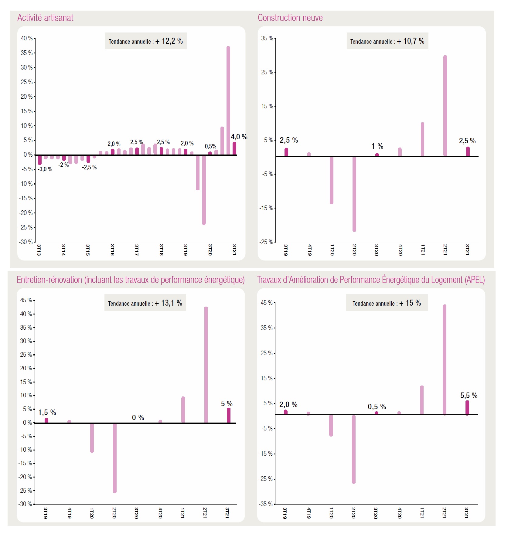 Rien n’arrête l’artisanat du Bâtiment depuis un an et il obtient sur ce troisième trimestre encore un très bon résultat avec une progression de 4%. Sur ces douze derniers mois, la courbe de croissance s’établit désormais à +12%. L'activité est particulièrement stimulée par les travaux de rénovation-entretien avec une hausse de +5%, dont +5,5% pour la seule rénovation énergétique, mais la construction neuve s’affiche, elle aussi, en positif à +2,5%.