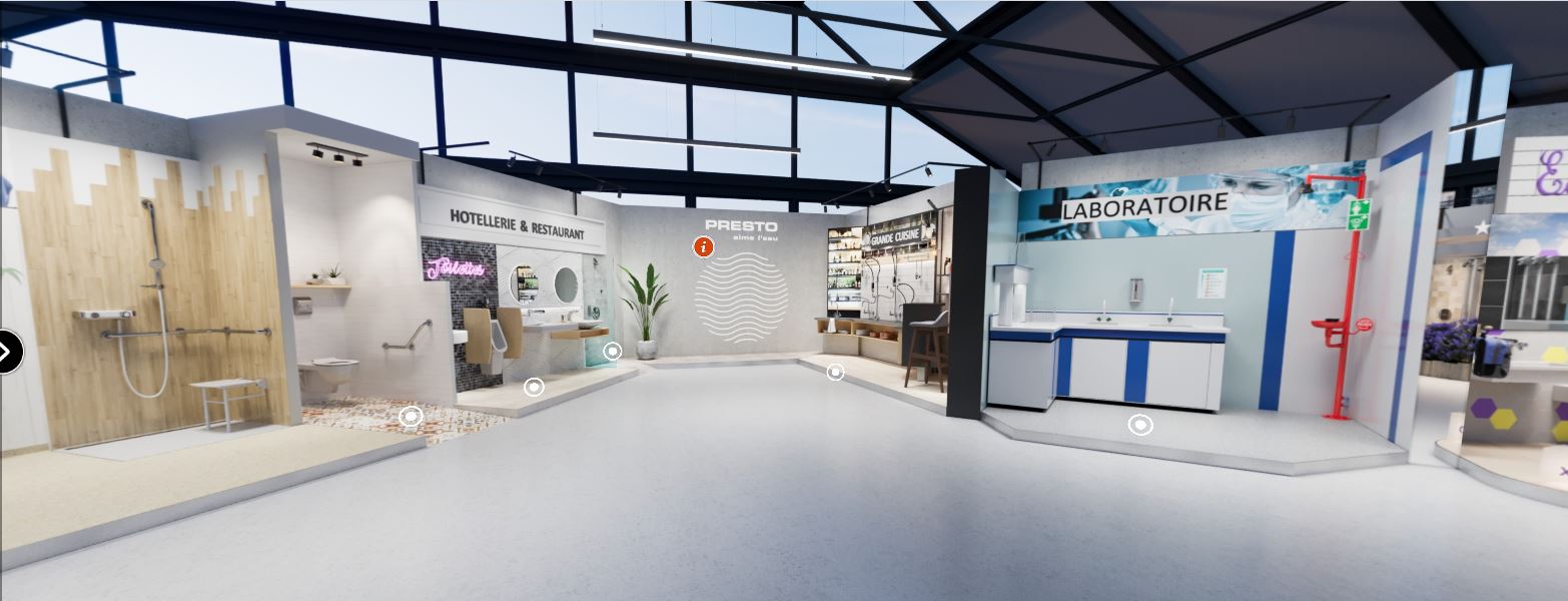 Le groupe Presto expose ses 3 marques : Presto (robinetterie de collectivités), Sanifirst (robinetterie des établissements de soins et Ehpad), et First Labo (robinetterie de laboratoires). L’entreprise souhaite ainsi proposer « un salon professionnel privatisé » en mode 100 % digital. Ce showroom virtuel est accessible depuis le nouveau site de Presto ainsi que depuis son centre de téléchargement. Afin d’humaniser la visite, ce sont les expertes produits elles-mêmes qui, à travers des vidéos, présentent les principaux points d’attention des gammes et technologies. Chaque produit est expliqué, détaillé et animé afin d’en comprendre les avantages et caractéristiques phares.