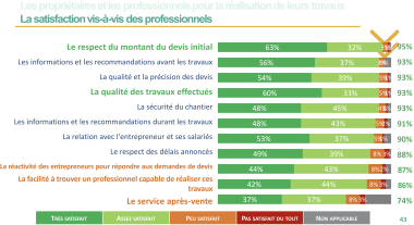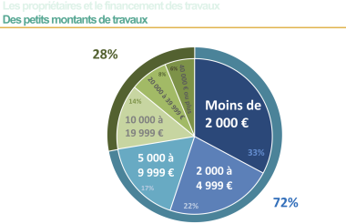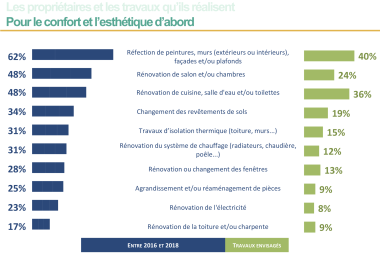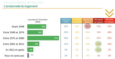 Une première observation s’impose : 64 % des propriétaires-occupants déclarent avoir récemment effectué des travaux chez eux (entre 2016 et 2018), tandis que 53 % envisagent d’en (re)faire. Ils habitent généralement dans des logements construits avant 1990, généralement des maisons individuelles (82 % des répondants), et sont bien installés dans la vie. Ils sont en couple ou en famille et appartiennent aux tranches d’âge les plus avancées (35-59 ans ou plus de 60 ans), avec un pouvoir d’achat confirmé (CSP+). Ceux qui se montrent le plus attachés à leur bien, lancent plus facilement des rénovations que les autres. Une faible proportion de particuliers (4 %) a abandonné son projet, généralement pour des raisons économiques, un manque de motivation ou une crainte quant aux délais ou aux résultats du chantier. Généralement ces particuliers habitent des logements d’avant 1948, plus complexes à réhabiliter. Une certaine frange des propriétaires-occupants (15 %) estime que son bien n’a pas besoin de subir d’amélioration, ou n’a juste pas envie de se lancer dans cette démarche. Ils avancent diverses raisons pour renoncer à des travaux : âge avancé, aléa de la vie, moindre exigence pour le logement, ou encore habitat jugé peu propice (très récent ou au contraire obsolète, mal situé).