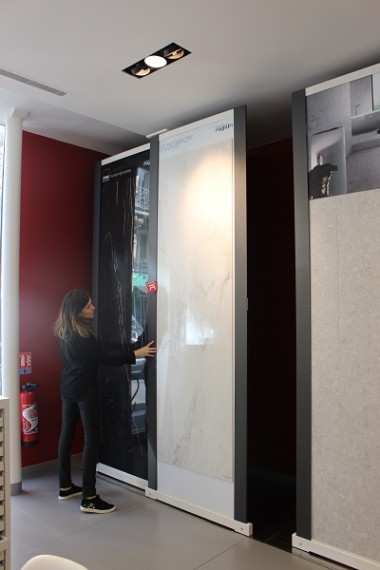 Ce qui a changé ? Au rez-de-chaussée : la zone dédiée à l’offre sol est désormais présentée intégralement par typologie de produits (aspects pierre, carreaux de ciment, granito, terrazzo…) ; tandis que des modules d’exposition de carreaux grand format (120 x 240 cm) ont intégré l’exposition et deviennent désormais « l’une des spécialités du showroom », selon Nawel Bouzenad.