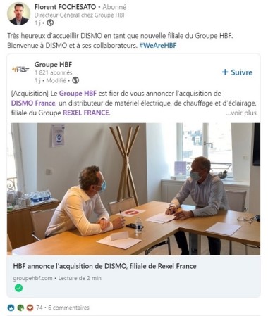 EN PHOTO • Sur LinkedIn, ce mercredi 3 mars en début de soirée, plusieurs professionnels de la distribution Bricolage et experts du marché y sont allés de leurs commentaires pour évoquer le mariage entre HBF et Dismo. À l’instar de ce consultant en management et gestion du changement qui y a posté ce “clin d’œil” : « Chapeau !!! Le courant passe »… Quant à Cyril Barreteau qui pilote les chantiers digitaux chez HBF, c’est sous forme de hashtags qu’il s’est exprimé : « #WelcomeDISMO #HBFGrowth ». Selon le repreneur, sa « position dominante sur ses marchés permettra rapidement à Dismo de renouer avec la croissance ».