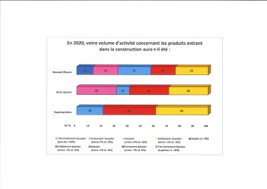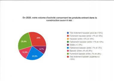 Par secteur d’activité, les points de vue sur l'avenir proche divergent fortement. En Gros-Œuvre, 60 % des professionnels parle de stabilité et 30 % de progression. En Second-Oeuvre, ils sont plus partagés : 32 % tablent sur une baisse, 31% sur la stabilité et 38 % sur une hausse. Ce sont en définitive les Équipementiers qui se montrent les plus optimistes avec 80% qui s’attendent à une hausse, et 20 % à une faible baisse.