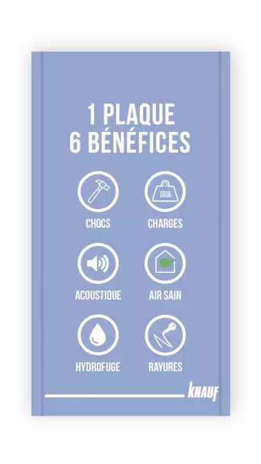 Nous avons utilisé des plaques Diamant 13 Cleaneo C Hydro . Ce type de plaques cumule très haute résistance, qualité de l'air intérieur et isolation phonique . Elles sont conçues pour supporter des éléments très lourds avec 55 kg par points de fixation. En prévoyant plusieurs points de fixation pour suspendre les meubles, on atteint la résistance souhaitée, 110 kg avec 2 fixations (2 x 55 kg) , près de 220 kg avec 4 etc. Cela sans forcément attraper l’ossature de soutien. Bref c’est plus simple, et le résultat est garanti.