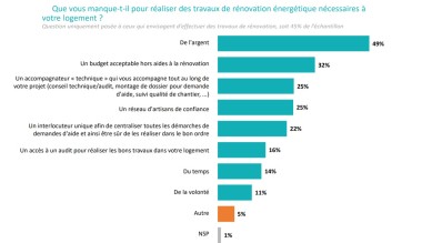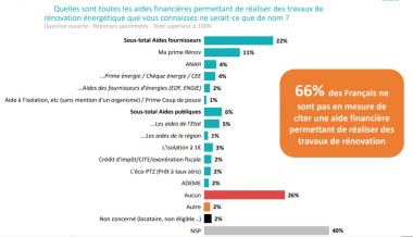 Ce bilan établi, le panel a été sondé également sur leur niveau de connaissances des dispositifs d’aides financières. Et sur ce point, les réponses interrogent sur l’efficacité des campagnes de communication des Pouvoirs Publics puisque 2 Français sur 3 ne connaissant aucune de ces aides. Et pourtant, le budget semble le nerf de la guerre avec une personne sur trois qui hésite à réaliser au moins un type de travaux estime ne pas en avoir les moyens financiers (34 %). Plus parlant encore : 53% des personnes qui parlent de nécessité de travaux dans leur logement disent manquer d’argent pour les entreprendre.