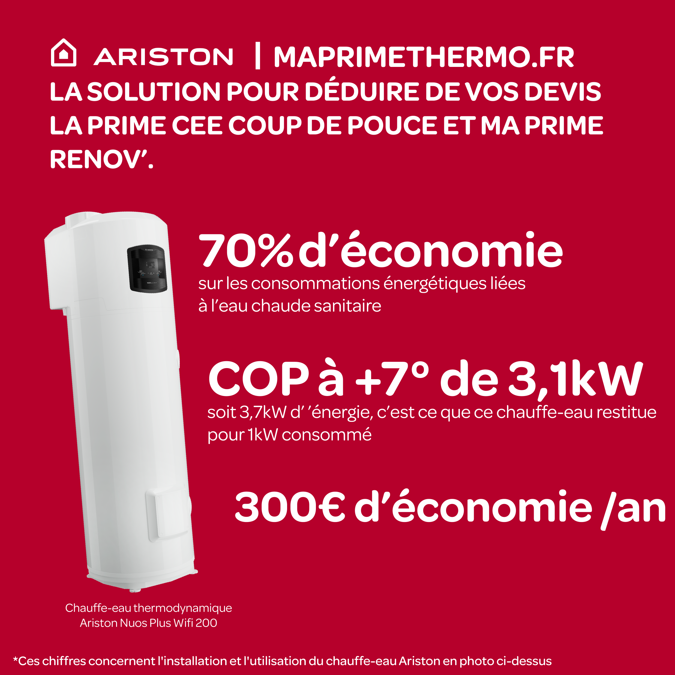 L'infographie ci-dessous illustre les avantages pour l'installation d'un chauffe-eau thermodynamique Ariston Nuos Plus Wi-fi 200 d’une capacité de 200 litres.
