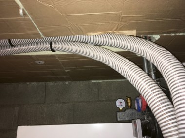 Légende photo : Les tuyaux de transfert des granulés de la chaudière, fixés à la dalle, n’ont pas été dévoyés lors des travaux d’isolation : l’isolation n’est pas totalement continue. ©AQC