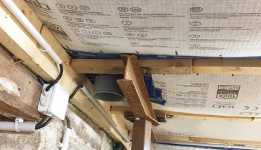 Légende photo : La membrane frein vapeur hygrovariable est positionnée du côté non chauffé de la paroi (isolation d’un plancher bois sur cave par insufflation de ouate de cellulose entre solives). ©AQC