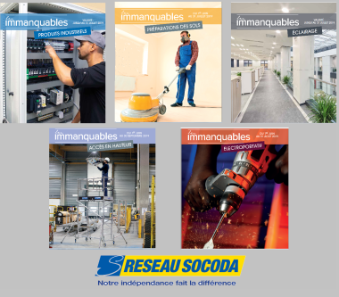 Rassemblé sous le nom Les Immanquables Socoda, les opérations promotionnelles du réseau de négoces vont porter sur l'ensemble de ses secteurs d'activités. Cinq catalogues sont ainsi déployées dans le réseau pour proposer des offres à tarifs réduits en Électricité, Décoration, Outils-Pro Industrie et Sanitaire-Chauffage-Plomberie.