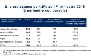 un marché du Bâtiment désormais mi-figue, mi-raisin, le Groupe Hérige a affiché un chiffre d’affaires en hausse de +4,9 % (à 154 M€) à périmètre comparable sur les trois premiers mois de l’exercice 2019 par rapport au premier trimestre 2018, malgré un jour ouvré en moins. Dans un communiqué, le fabricant et distributeur multirégional souligne que « l’activité Négoce de matériaux ressort en progression de +2,5 % à périmètre comparable portée par l’activité Travaux Publics et les ventes aux particuliers ». En revanche, sa branche Menuiserie industrielle, « malgré