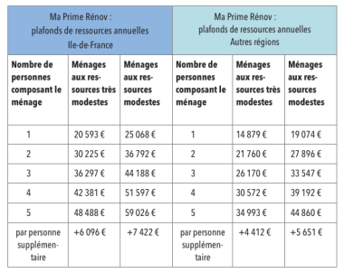 Il s’agit des conditions de ressources appliquées par l’ANAH. Depuis, le 1er janvier 2020, l’obtention et le versement de ces aides dépendent exclusivement de l’ANAH. Ces plafonds varient en fonction des régions et du nombre d’occupants du foyer : plus d'infos sur le site de l'ANAH