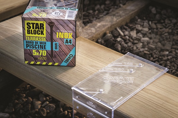 Résultat : la décision a été prise d’intégrer directement au packaging des vis terrasses un outil indispensable, le gabarit de perçage. « Jusqu’alors, les vis étaient dans des seaux. Désormais, elles sont dans des boîtes et grâce au gabarit intégré, l’utilisateur peut très facilement effectuer son pré-perçage grâce à des repères adaptés et à une cale pour gérer l’écartement des lames de terrasses (de 4 à 6 mm) », précise Olivier Leguellec.