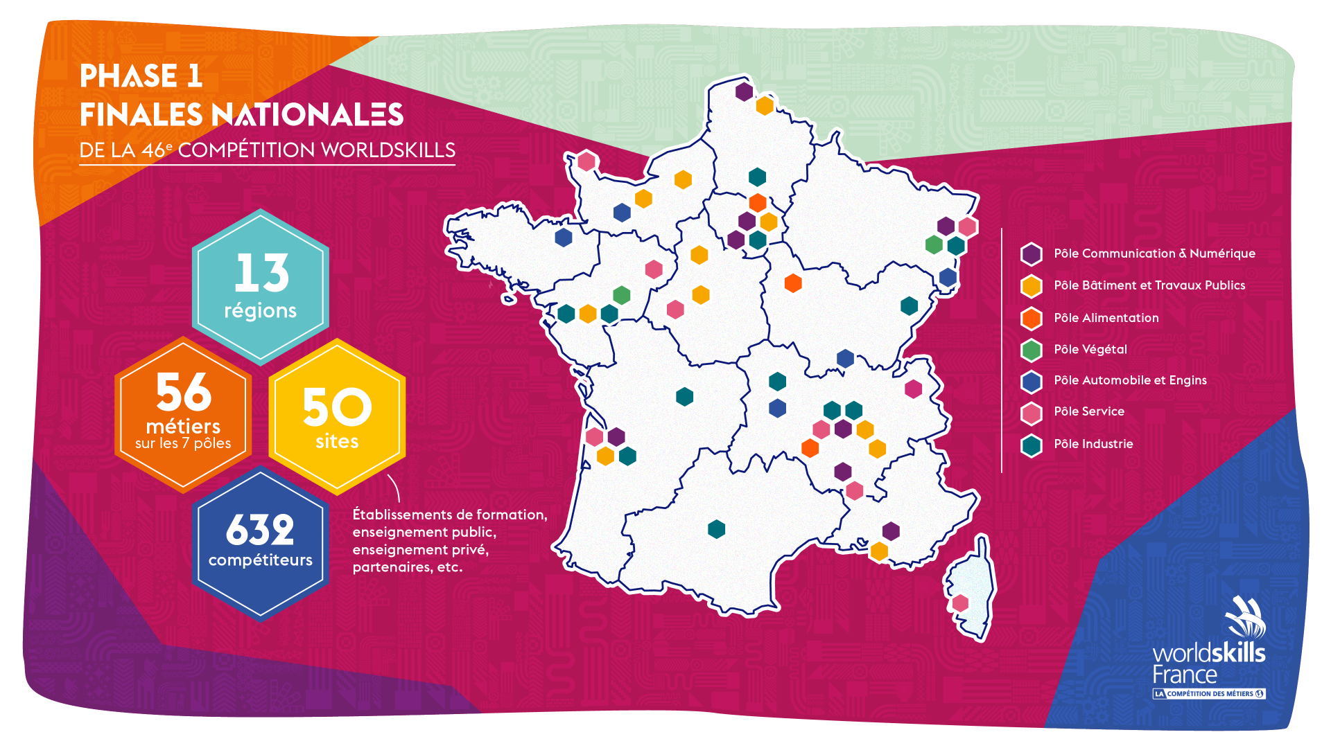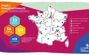 13 régions , 56 métiers, 50 sites et 632 compétiteurs, WorldSkills France a dévoilé le nouveau format de sa compétition des métiers prévue sur l’ensemble du territoire national. Les Finales Nationales de la 46e compétition WorldSkills s’organiseront en deux phases entre le 30 mars et le 16 octobre 2021. Une première phase organisée par métier sur le territoire métropolitain en 2021 pour 56 métiers et une seconde sur site unique à Lyon début 2022 qui réunira tous les compétiteurs régionaux des 61 métiers en compétition.